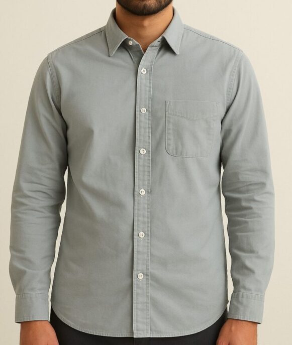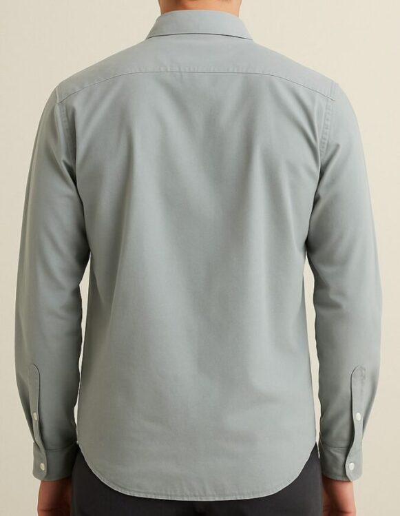 Steel Grey Cotton Casual Shirt, This steel grey casual shirt is a wardrobe essential, crafted from soft and breathable cotton for all-day comfort. Featuring a classic spread collar, a neatly stitched front button placket, and a single chest pocket for added utility, the shirt offers a sleek and timeless look. The long sleeves come with buttoned cuffs, while the back remains clean and minimalistic, enhancing the sophisticated appearance. The slightly curved hemline and regular fit make it ideal for both casual and semi-formal wear.