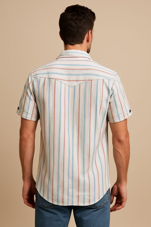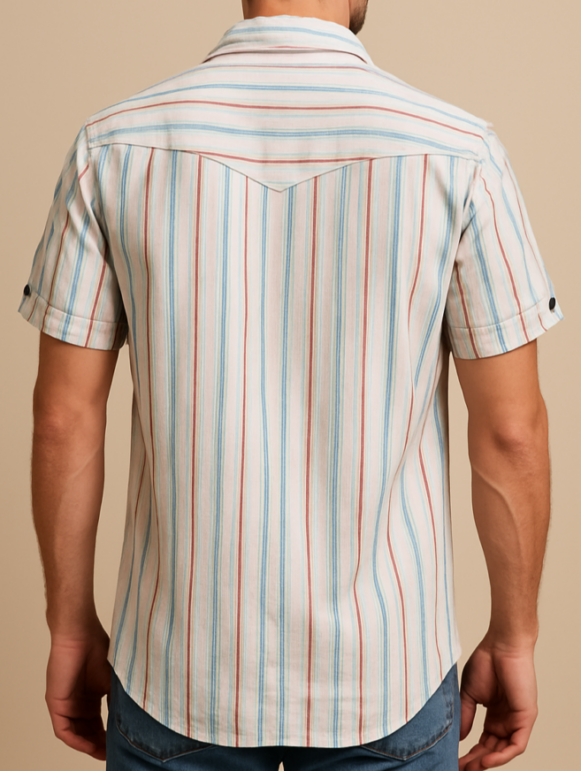 Striped Denim Western Shirt, This men's short-sleeve shirt blends classic western styling with contemporary comfort. Crafted from soft, breathable denim, it features a multicolor vertical stripe pattern in tones of light blue, red, and cream. Distinctive western details include a pointed yoke on both front and back, dual flap chest pockets with button closures, and contrast black buttons running down the placket. A small "STAR" embroidered logo adds character to the left chest. The fold-up button tab sleeves offer adjustable styling options, making it a perfect pick for casual summer wear or layering.