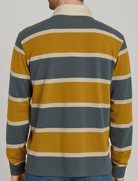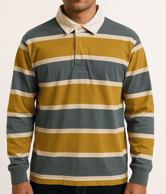 This classic polo t-shirt features bold horizontal stripes in mustard yellow, slate blue, and cream. Made from soft, breathable fabric, it includes a traditional polo collar in off-white with a concealed button placket. The long sleeves and ribbed cuffs add comfort and a refined finish, making it perfect for both casual and semi-formal outings. Pair with jeans or chinos for a smart everyday look.