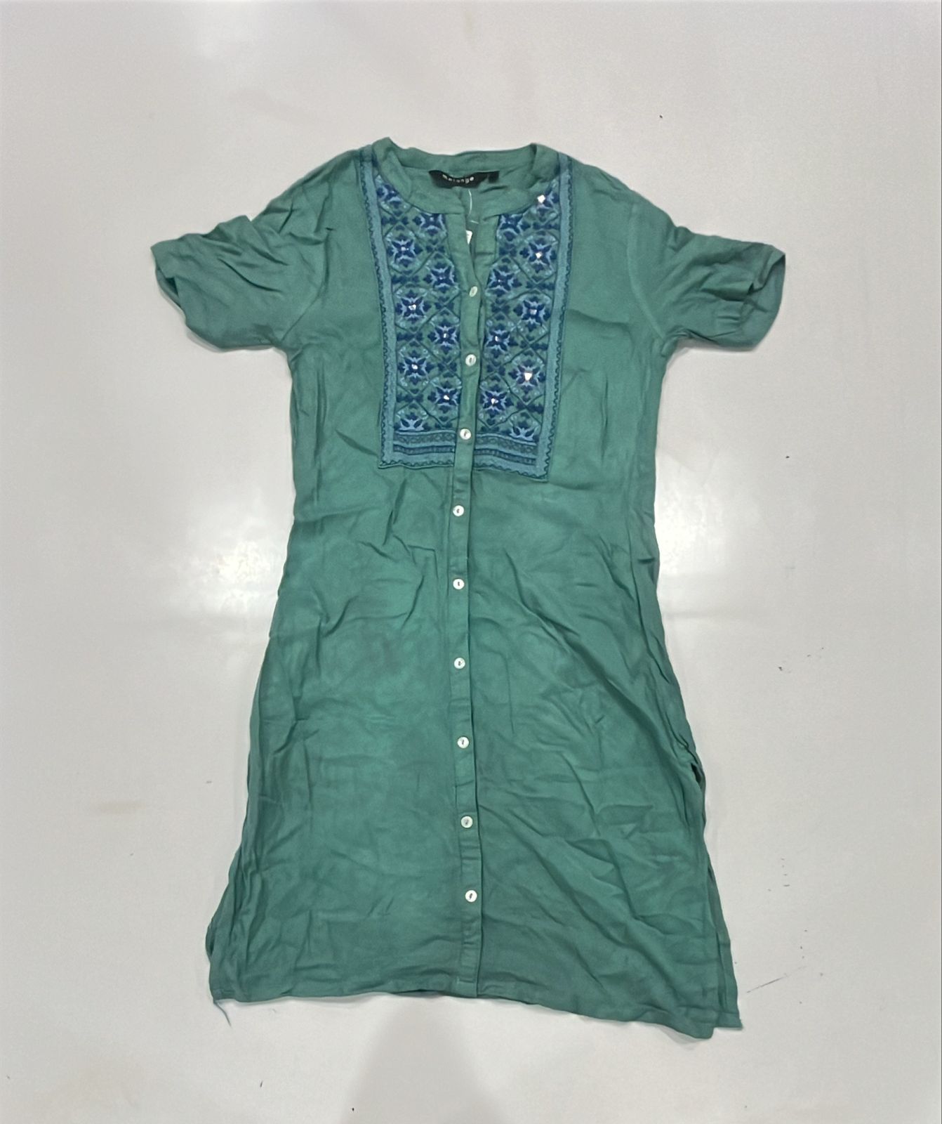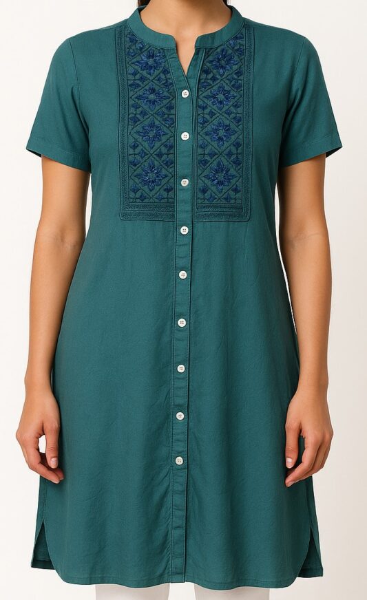This elegant teal blue short kurta is crafted from soft breathable cotton fabric, perfect for everyday wear. Featuring intricate navy blue floral embroidery on the yoke, a mandarin collar with a notch, and front button-down closure, it combines comfort with contemporary styling. The short sleeves and straight hemline offer a flattering fit, while the minimal back design maintains a clean, sleek look. Pair it with white leggings or pants for a versatile ethnic look.