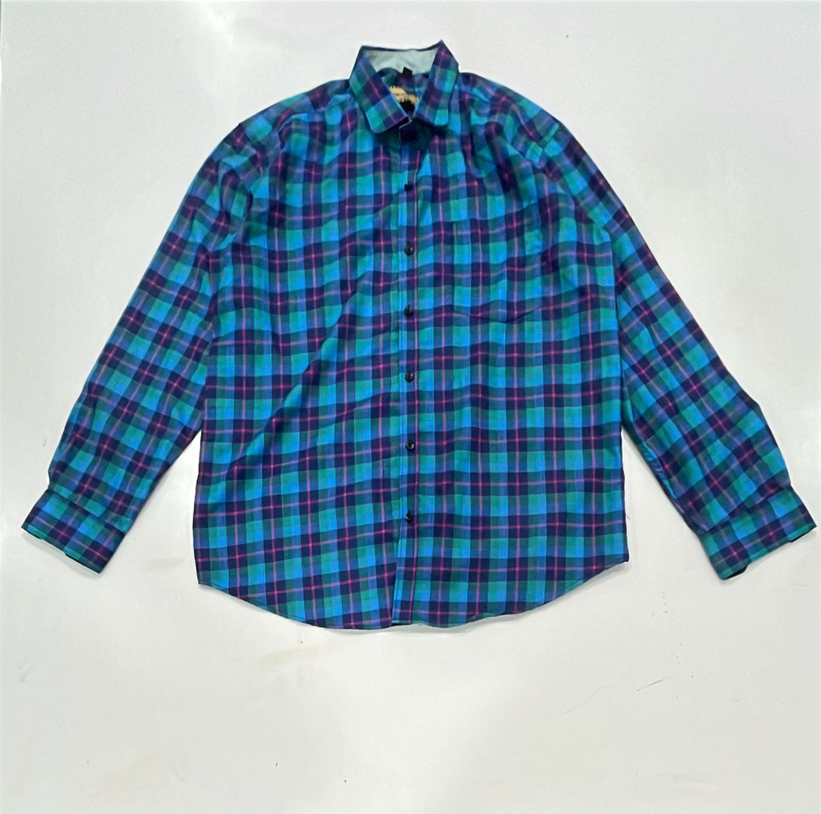 A stylish and comfortable men's shirt crafted from soft, breathable fabric in a vibrant teal base featuring navy blue and purple checks. Designed with a classic spread collar, full button-down front, and long sleeves with buttoned cuffs, this shirt offers a perfect blend of casual and semi-formal appeal. The shirt is tailored for a regular fit with a straight hem and no chest pocket, making it ideal for layering or standalone wear.