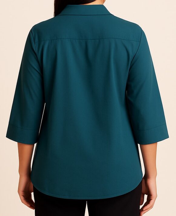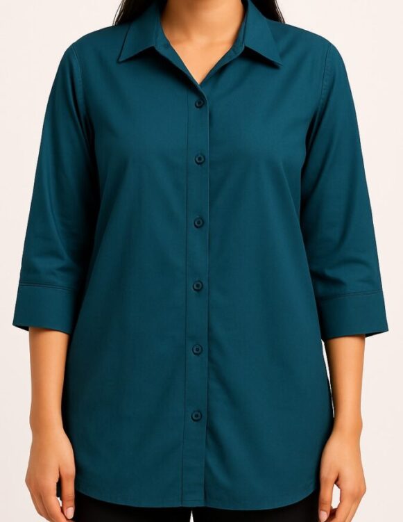 This women's teal button-down shirt offers a clean, structured silhouette with a relaxed fit, perfect for both professional and casual wear. Featuring a classic spread collar and 3/4 length sleeves, the shirt is made from smooth, high-quality fabric that ensures comfort throughout the day. The front is detailed with tonal buttons, while the back remains seamless and plain for a sleek finish. Designed for ease of movement and a flattering drape, it pairs effortlessly with trousers or jeans for a polished look.