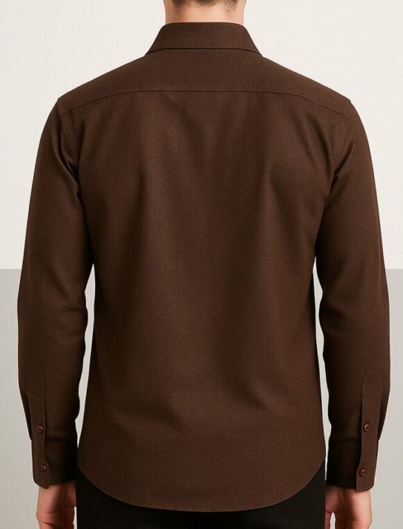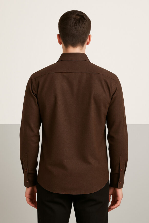 Elevate your wardrobe with this refined full-sleeve formal shirt crafted from a lightweight cotton-blend fabric. Featuring a subtle micro cross-hatch texture in deep chocolate brown, this shirt includes a wide spread collar, single chest pocket, reddish-brown buttons, and a straight hem. The shirt offers a structured silhouette with a plain back yoke for a polished look