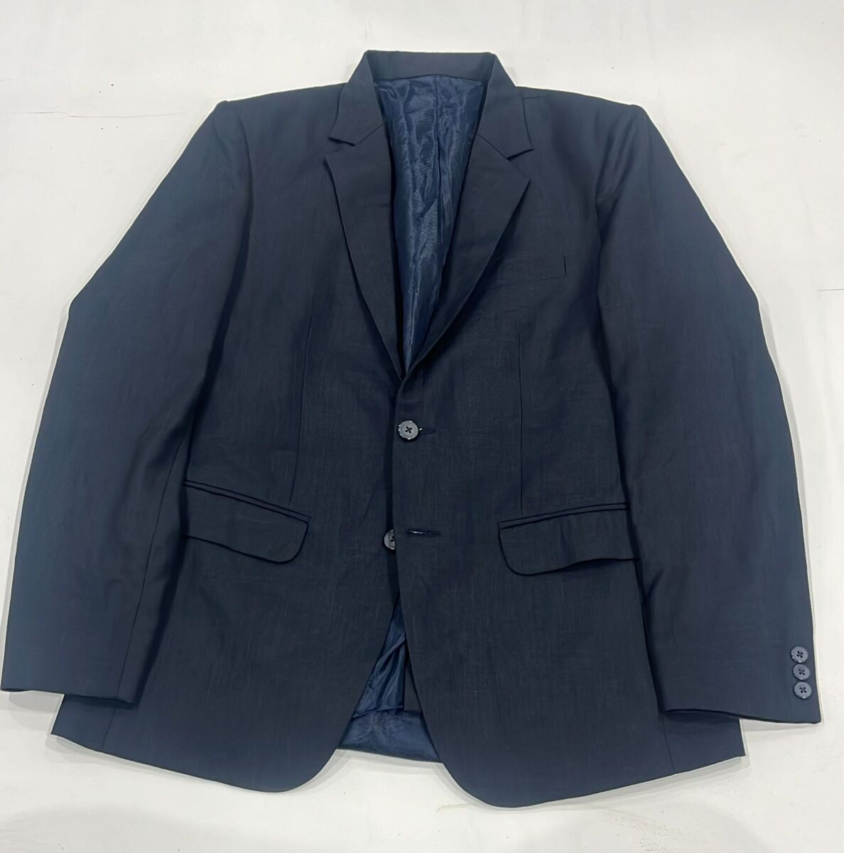 The ultimate foundation for professional and smart-casual attire, this classic navy blue single-breasted blazer is a rental must-have. Crafted from a structured, comfortable fabric, it maintains a sharp silhouette and excellent drape