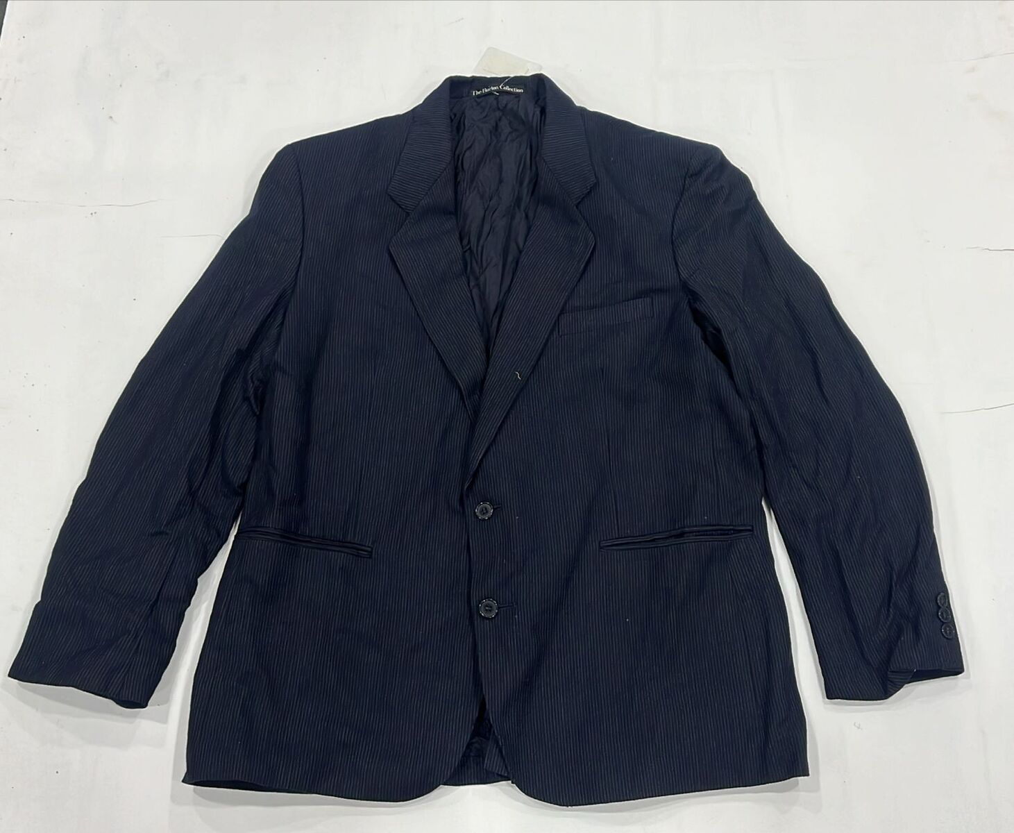 The deep Navy Blue or Black base is subtly enhanced by fine, vertical pinstripes, creating a classic professional look that instantly elongates the wearer
