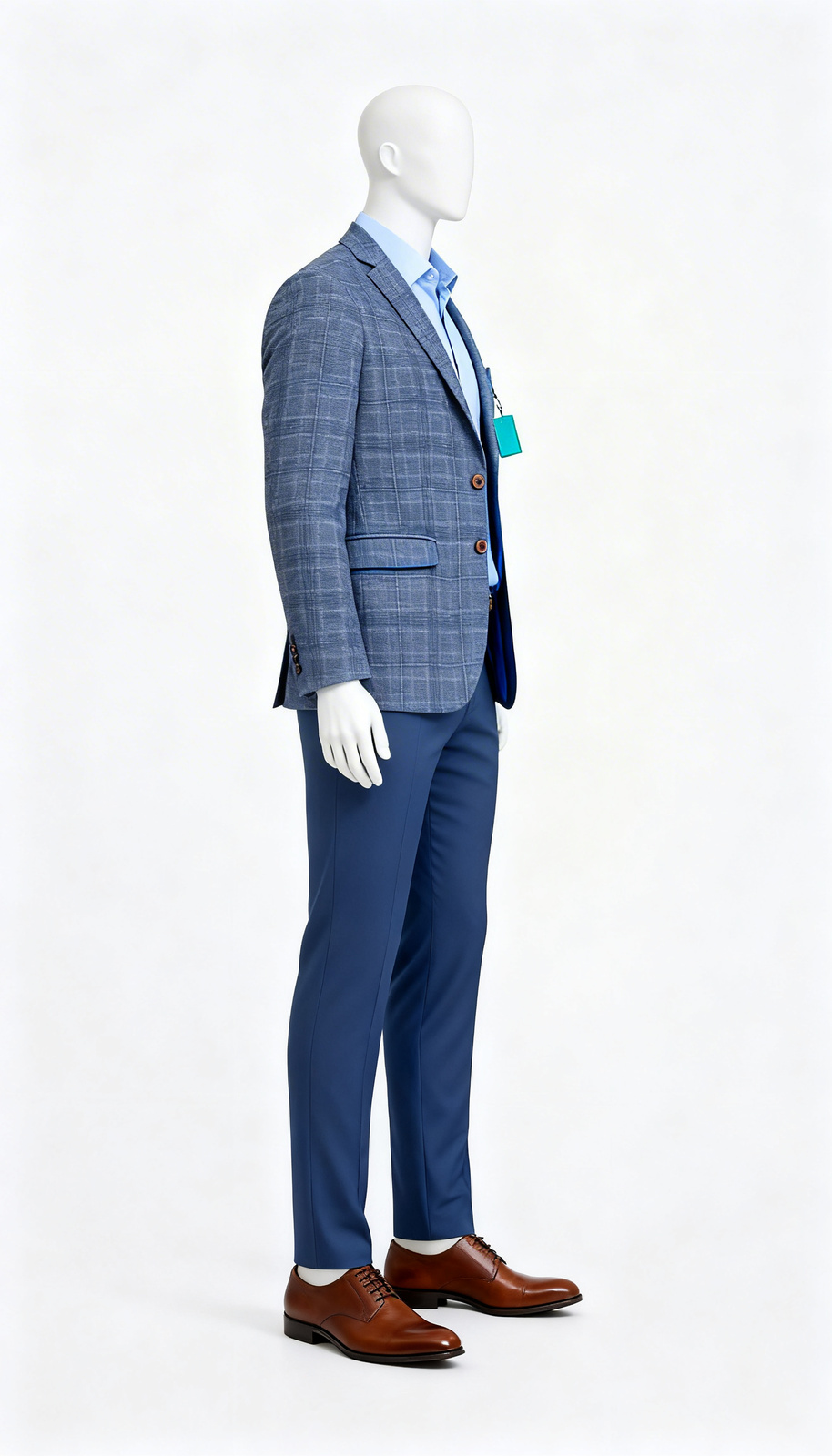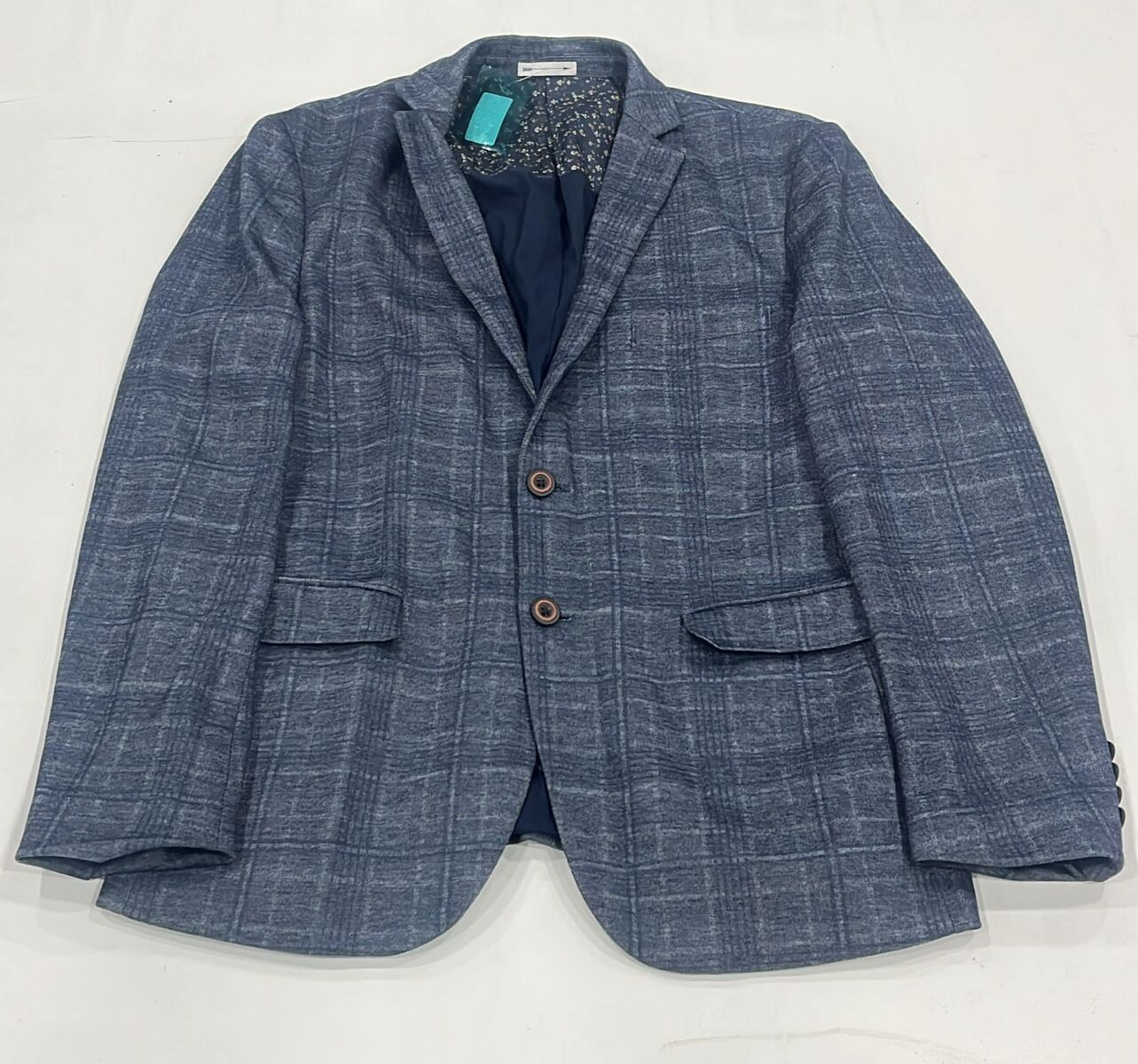 . The textured fabric, in a muted Dusty Blue hue, provides a rich depth, while the large check pattern ensures a contemporary, eye-catching look. Featuring a classic two-button closure and a tailored fit