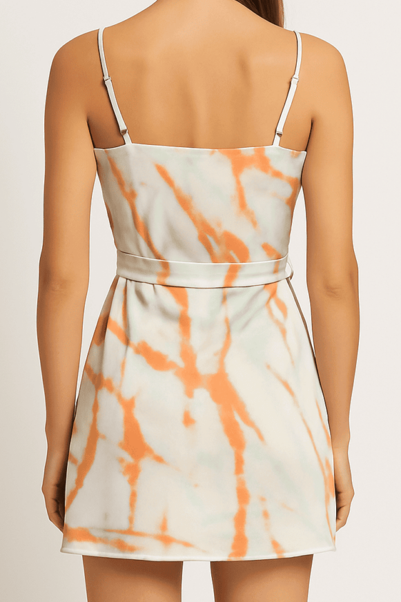 Tie-Dye Spaghetti Strap Belted Dress Step into summer style with this vibrant tie-dye mini dress featuring a soft blend of orange and aqua tones. Designed with delicate spaghetti straps and a flattering scoop neckline, this dress offers a lightweight, breezy feel perfect for warm days. The adjustable waist tie enhances the silhouette, while the short hemline adds a playful, youthful touch. Ideal for casual outings, beach days, or weekend getaways.