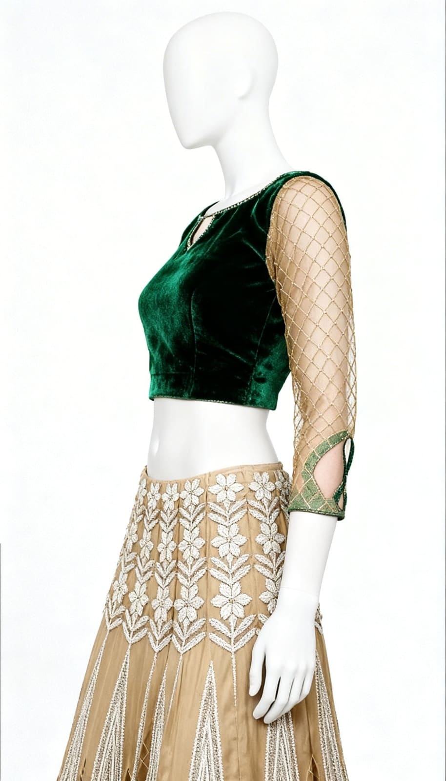 Golden lehenga skirt with thread embroidered in white. Velvet bodice in green with gold net sleeves. Padded. See size chart for lehenga length & fit. About the designer: The label caters to the taste for antiques, the designs are inspired from the vintage traditions of India.