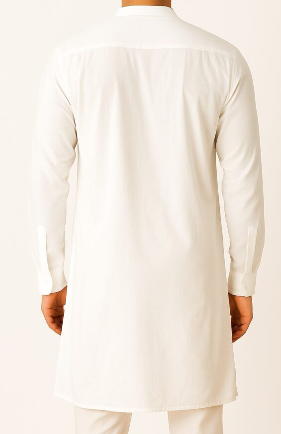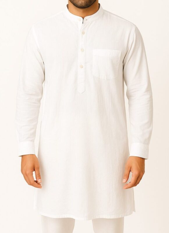 White Cotton Mandarin Kurta, This classic white kurta is crafted from soft, breathable cotton, offering a timeless and elegant look for festive, formal, or daily wear. Designed with a mandarin collar and wooden-look buttons, it features a short button placket, single chest pocket, and long sleeves with buttoned cuffs. The straight hem and side slits provide both style and ease of movement. The back is clean and plain, adding to its minimal appeal. Ideal for pairing with churidar, pajama, or trousers for a polished ethnic ensemble.