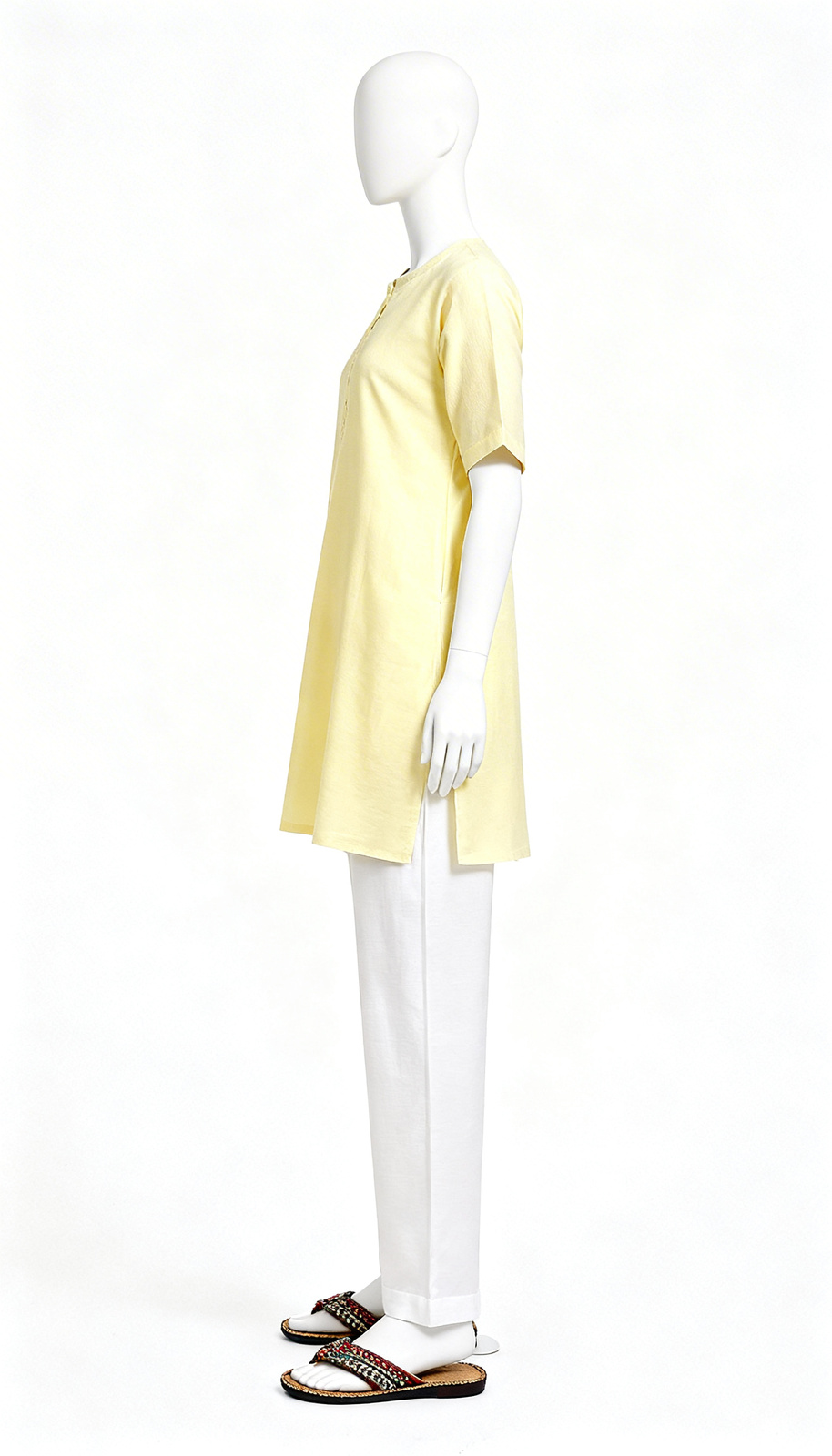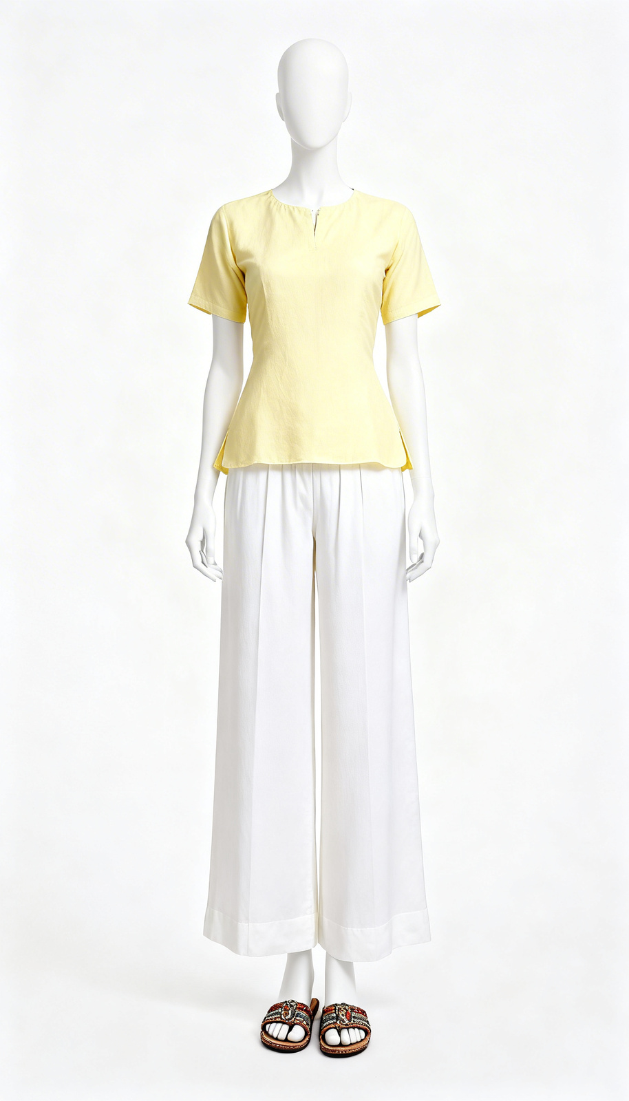 This white wide-leg palazzo is crafted from lightweight, breathable fabric that offers effortless drape and comfort. The relaxed silhouette provides free movement, while the elastic waistband ensures a secure and easy fit. Perfect for pairing with kurtas, long tops, and festive outfits, making it a versatile essential for everyday ethnic wear and rental collections.