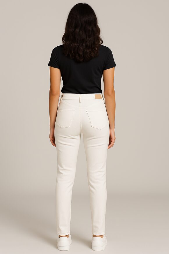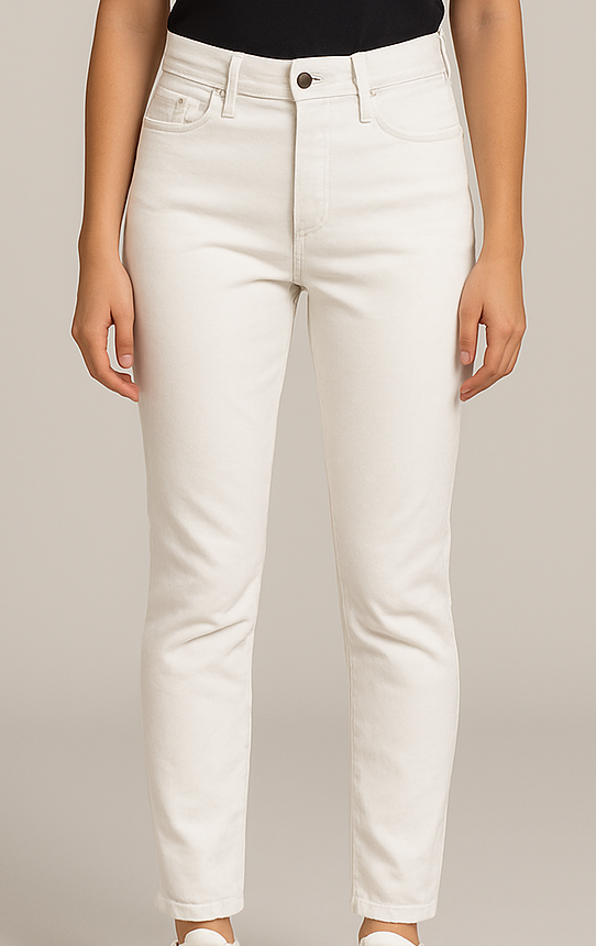 Elevate your everyday style with these women's high-rise slim-fit jeans in crisp white. Crafted from a premium stretch cotton blend, these jeans offer a flattering silhouette with a snug waist and a tapered ankle-length finish. Designed with a classic five-pocket construction, button closure, and belt loops, they pair perfectly with casual tees or smart tops for versatile wear.