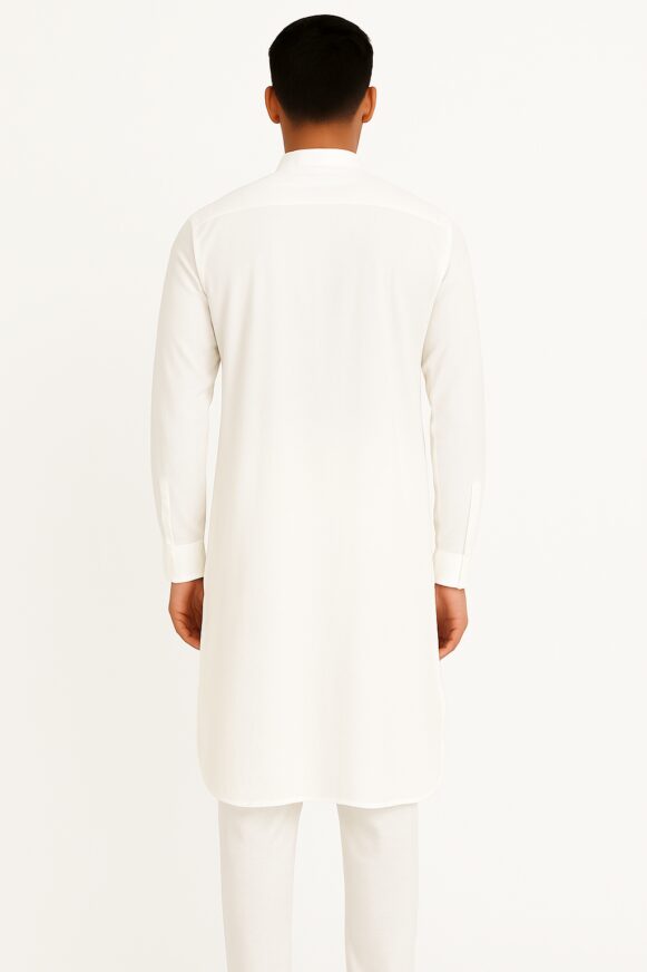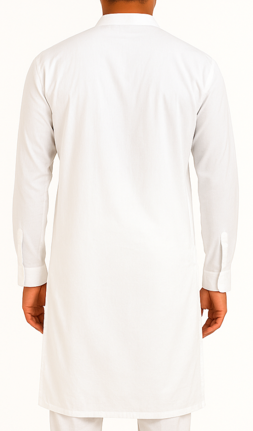 White Long-Sleeve Kurta, A pure white full-sleeve cotton kurta featuring a mandarin collar, half placket with buttons, and chest pocket—ideal for traditional wear.