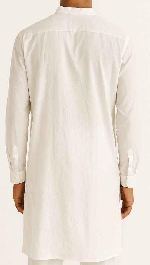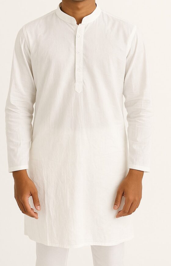 White Men’s Cotton Kurta, Classic white full-sleeve cotton kurta with mandarin collar and button placket – ideal for festive or casual traditional wear.