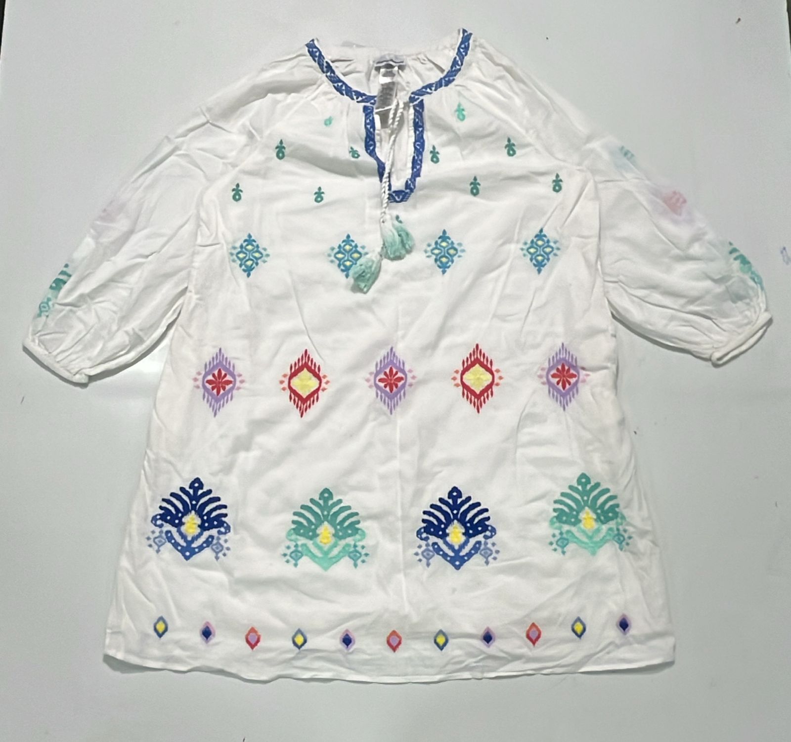 White Multicolor Embroidered Tunic Dress, White embroidered kurta with multicolor motifs, blue neck detail, and tassel tie-up. Relaxed fit and festive-ready.