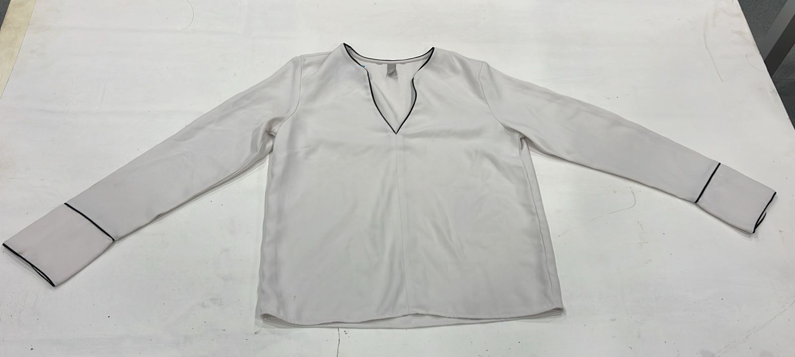 White V-Neck Long Top A refined white women’s top featuring a sharp V-cut neckline highlighted with a sleek black contrast trim that adds a modern and polished touch. Designed with long sleeves, this top is finished with wide cuffs accented with matching black piping, giving it a structured yet elegant appearance. The clean lines and subtle contrast detailing make it visually sophisticated without being overpowering.