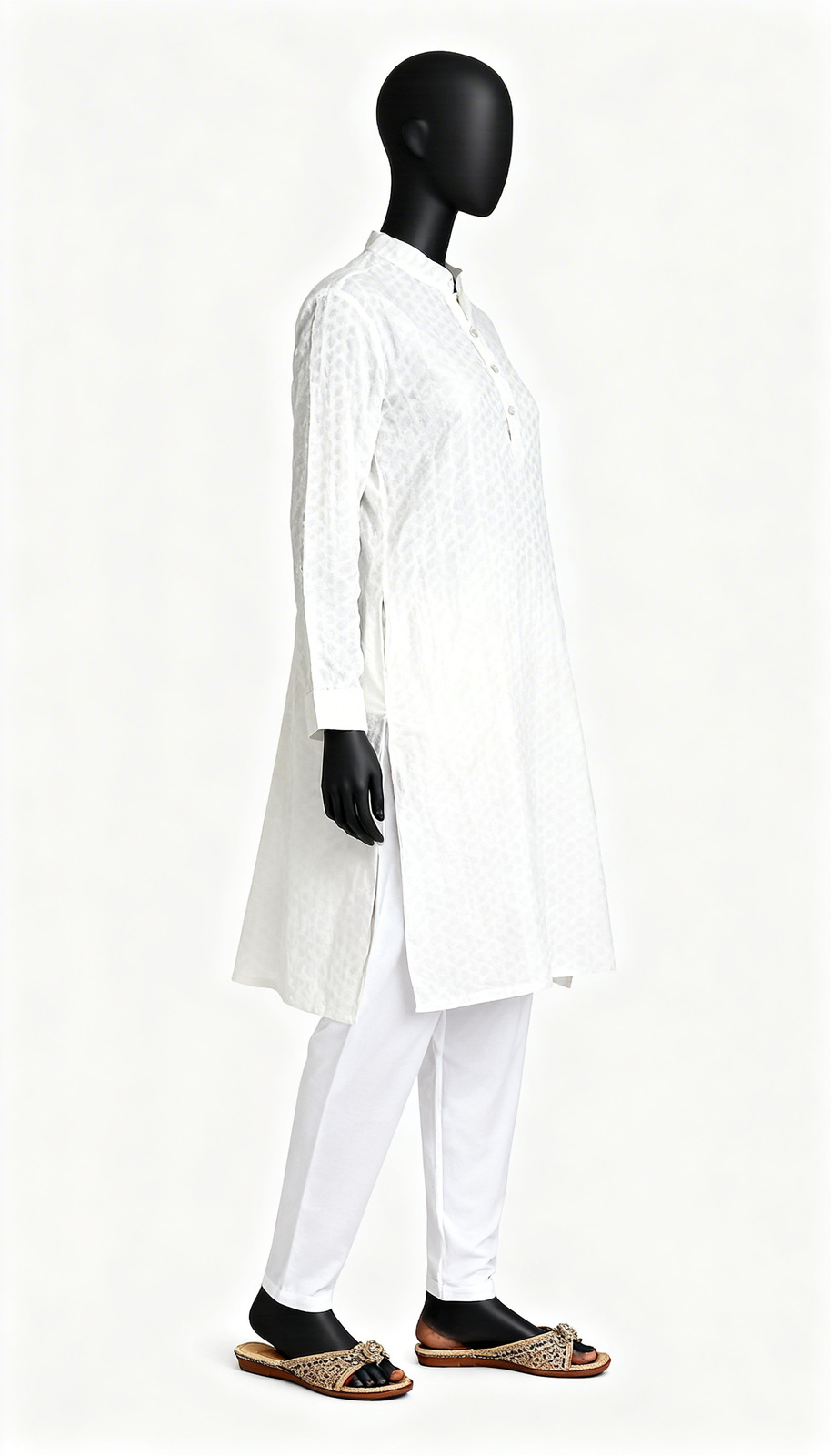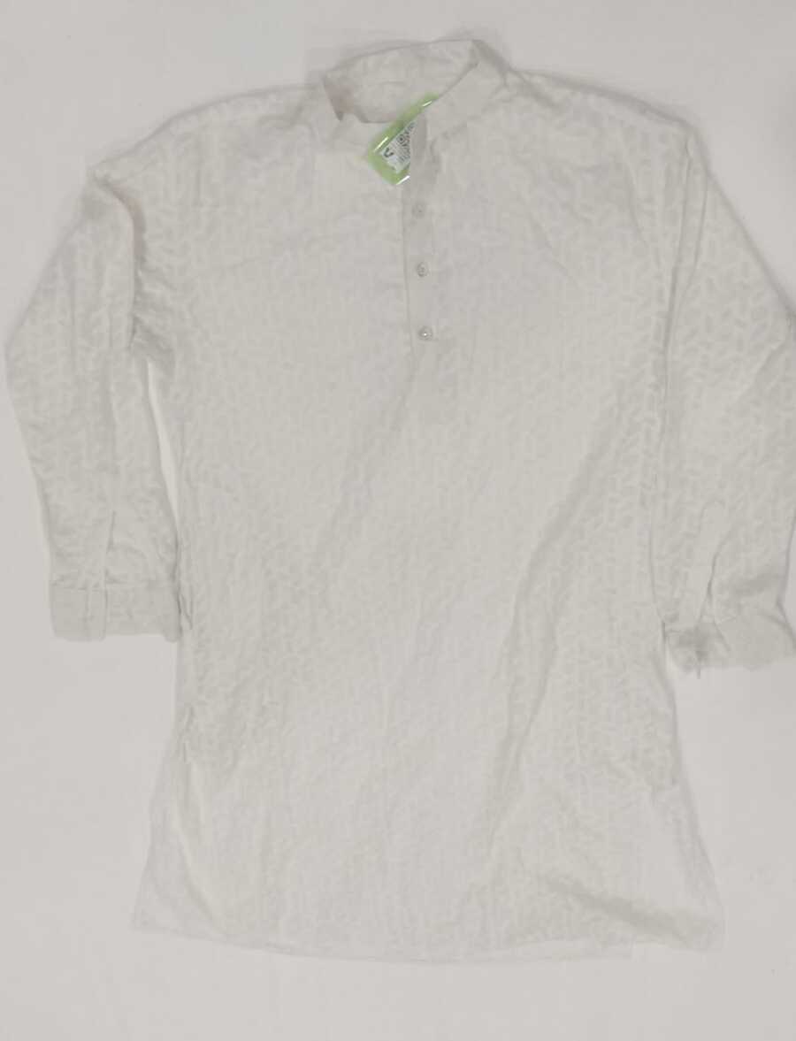 White self-design jacquard kurta with mandarin collar and full sleeves. Perfect for festive, pooja and family gatherings.