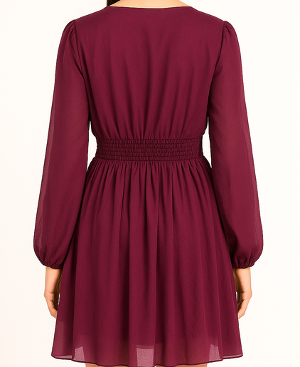 This elegant maroon dress is crafted from lightweight, sheer georgette fabric, perfect for both day and evening wear. Featuring a flattering V-neckline with a wrap-style bodice, it includes full-length sleeves with gathered cuffs for a voluminous touch. The cinched waist is accentuated with a matching fabric belt and a gold-tone double-ring buckle, while the flared skirt adds graceful movement. The back features a smocked waistband for added comfort and fit. Ideal for parties, brunches, or special occasions.