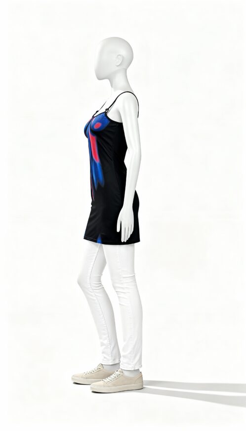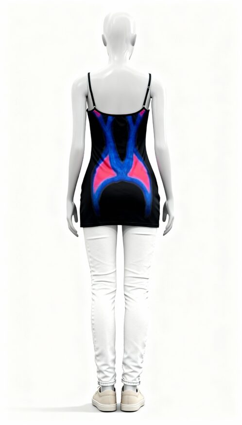 This fitted sleeveless dress is designed to make a confident style statement with its striking abstract pattern and contemporary silhouette. Featuring a bold mix of blue and red tones, the abstract design adds energy and visual impact, making the dress stand out effortlessly. The dynamic color combination creates a vibrant look that feels modern and expressive.