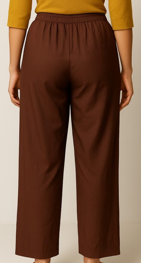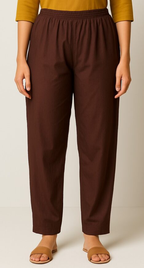 These classic brown cotton pants offer effortless comfort and everyday elegance. Designed with a mid-rise elasticated waistband and tapered straight fit, these ankle-length trousers are perfect for daily wear. The rich chocolate brown tone pairs beautifully with earthy tones and vibrant prints alike. Crafted from breathable, lightweight cotton, they make a versatile wardrobe essential for work, casual outings, or relaxed weekends.