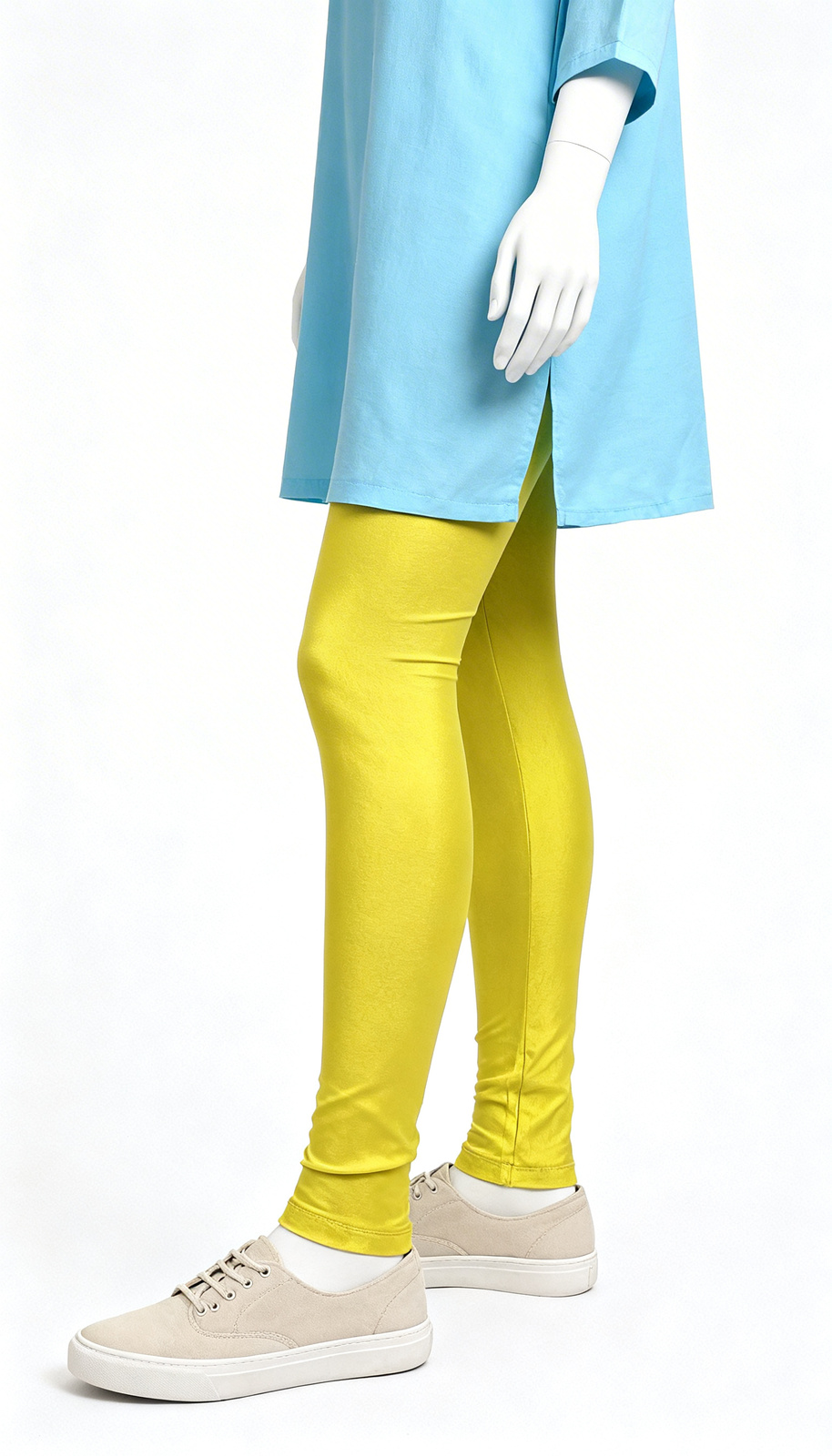 Yellow Solid Slim Leggings Yellow Solid Slim Leggings deliver a bodycon fit with solid pattern and ankle length cut. Crafted for daily wear, the smooth surface reflects slight shine and maintains structured appeal. The streamlined silhouette ensures flexibility and comfort for extended movement. Designed to remain camera friendly and non distracting across scenes. A bold primary wardrobe staple supporting high repeat wear and dependable durability.