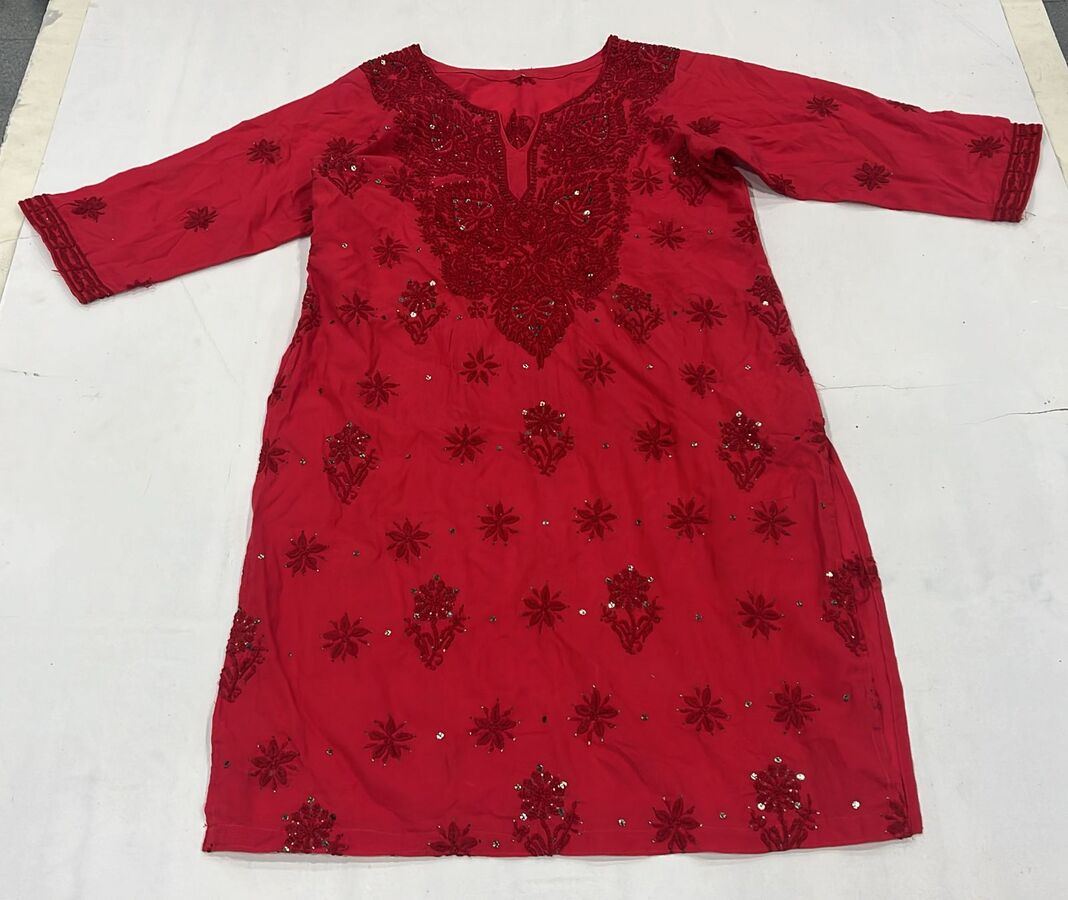 Elegant yellow cotton kurta with textured embroidery and 3/4 sleeves. Scoop neck and side slits for all-day comfort and style.